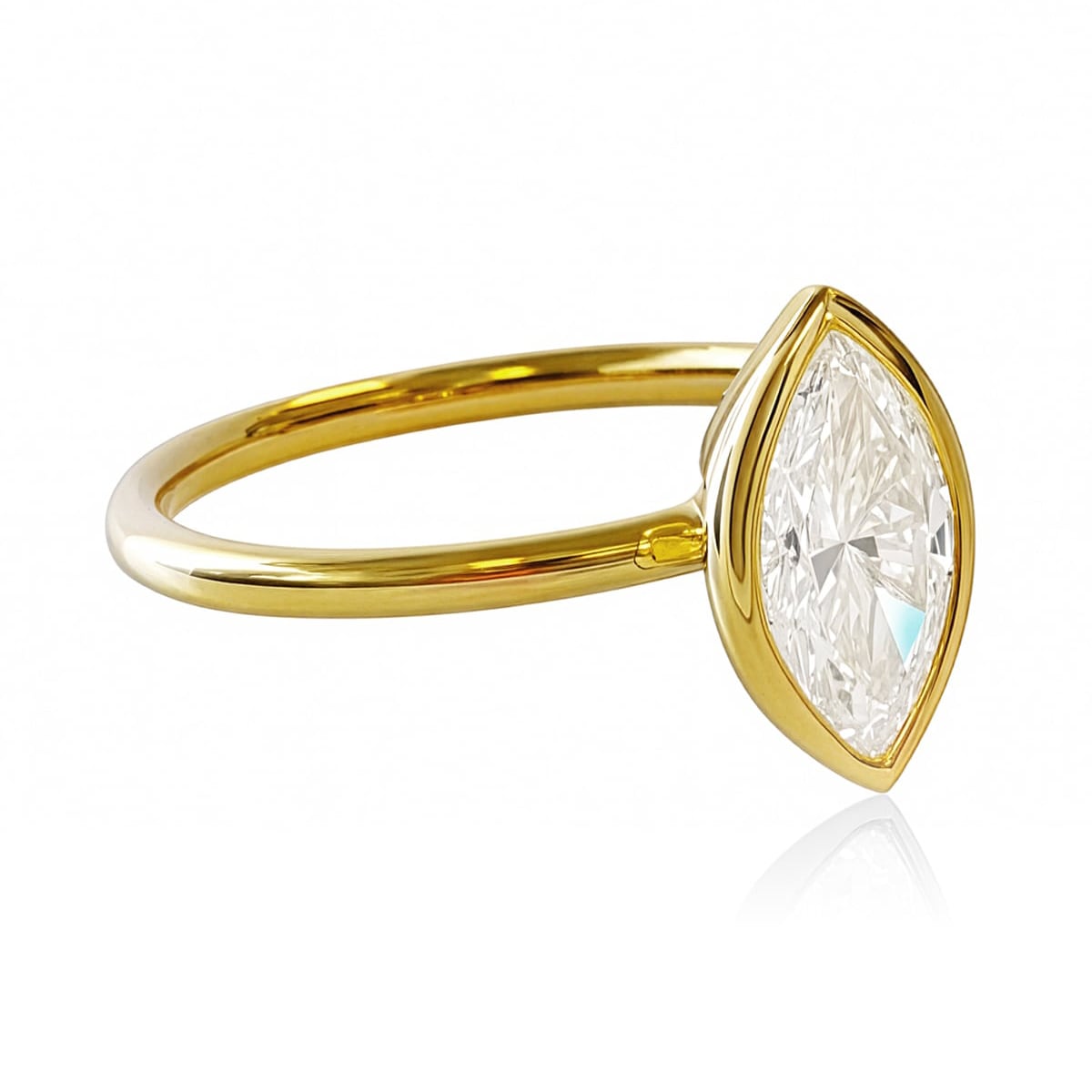 Discover understated elegance with Amber from The Madison Collection. Designed for those who appreciate modern refinement, this 18ct Yellow Gold Bezel Set Solitaire features a striking 1.53ct Marquise Cut Lab-Grown Diamond, blending bold form with effortless sophistication.